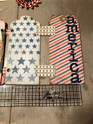 Knowing that my album will have an americana theme, I gather many of my patriotic papers, stamps, stencils and embellishments. I like to have everything at hand, I find it to be the easiest way for me to generate design ideas. Some of my favorite papers to use for red, white, and blue projects are from Tim Holtz Correspondence Paper Stash.