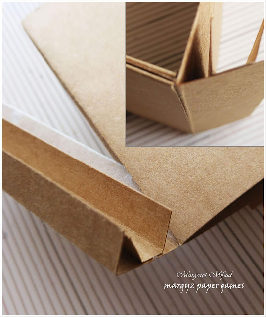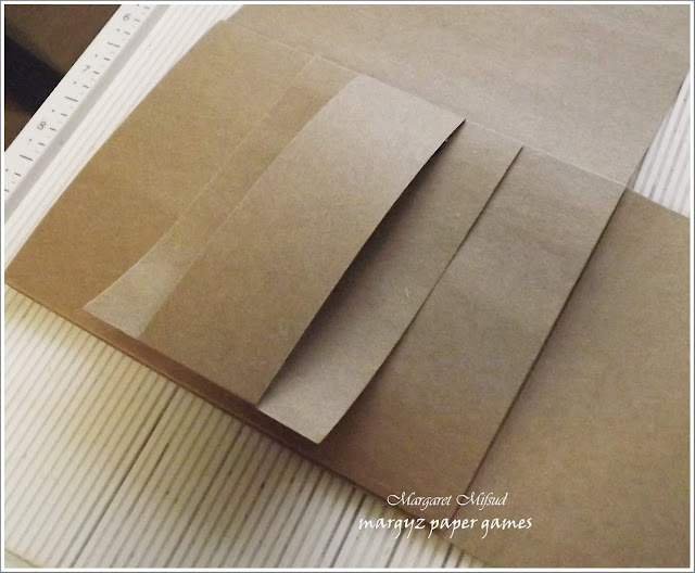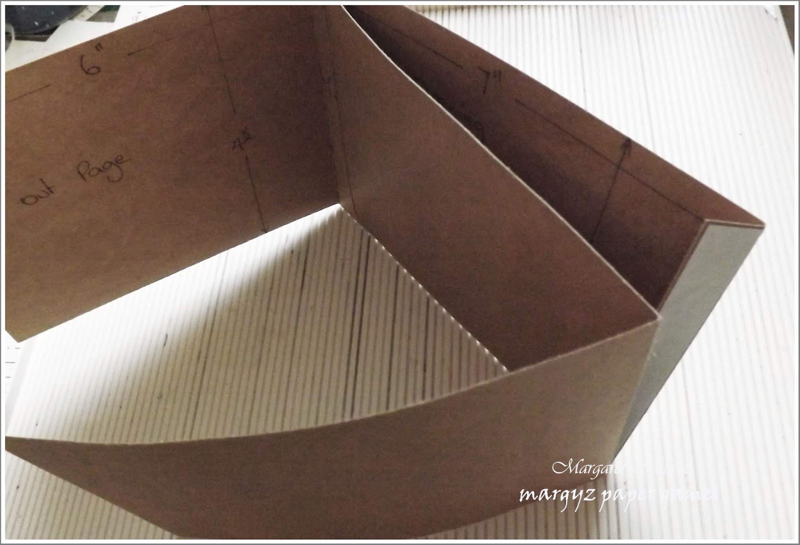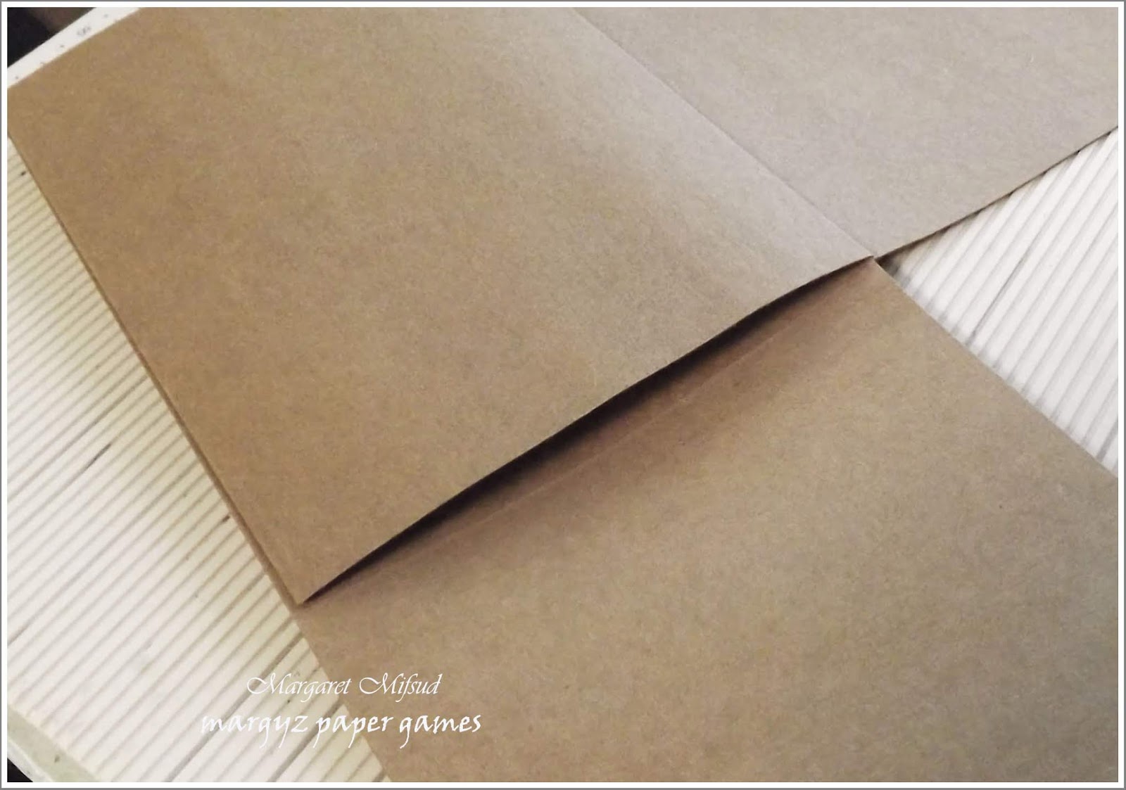 Having shown you the two different page sets I will give you a few insights into the constructions. It starts very simply with a base page. (The red dotted lines are the score lines) I tried to take photos as I was making the book itself but the black cardstock made it difficult to see the details so I cut it all out again in kraft card.