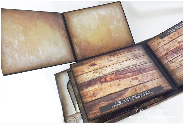 The outside of this album measures 5.5 x 6.5" and the inside pages are 4.5" x 6". The spine is 2" wide. The papers I've used are a mix from Studio Light's Industrial 2.0 paper pad and Kaisercraft's Factory 42 paper pad.